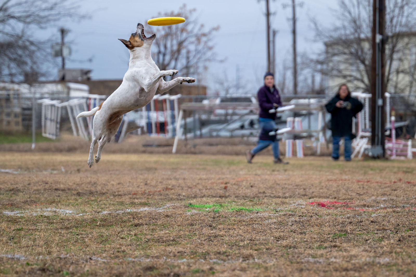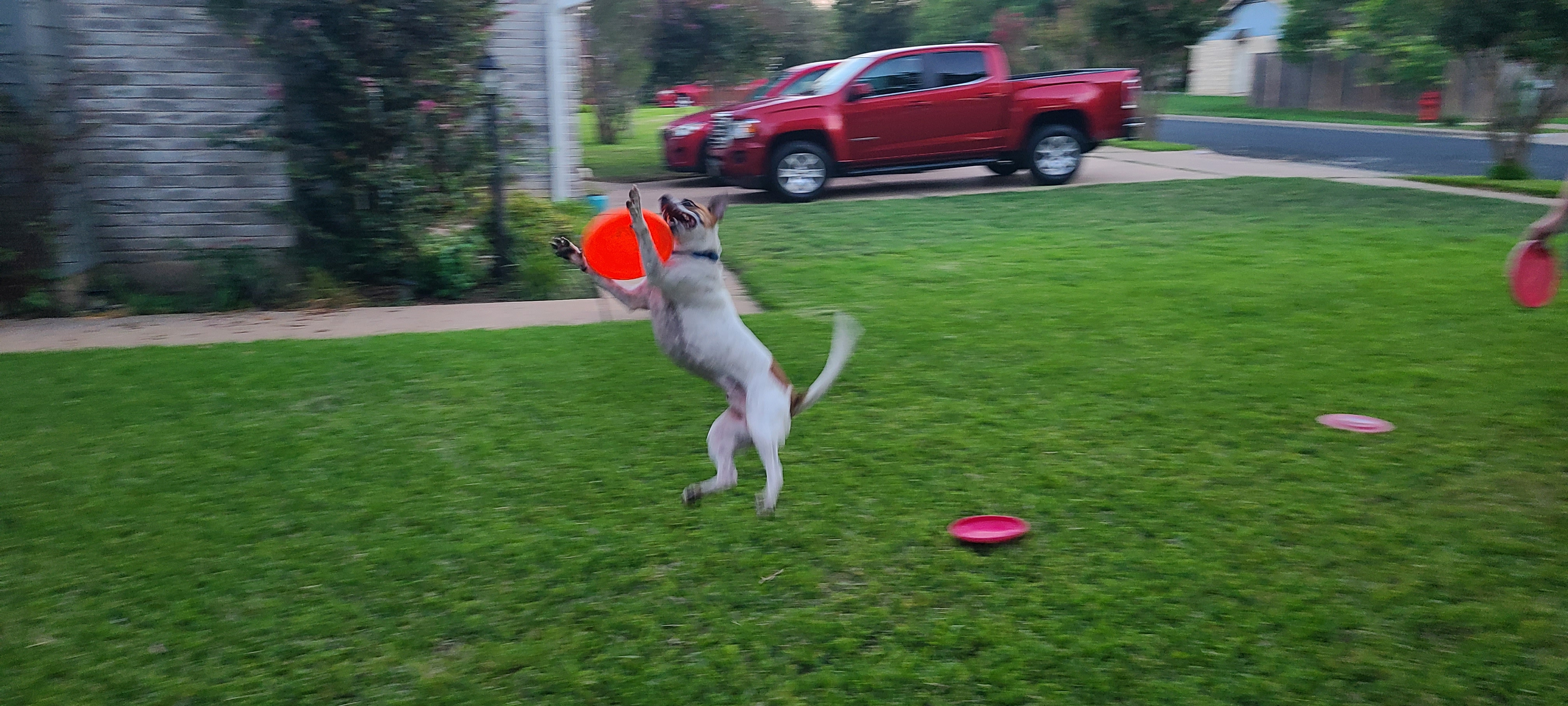 We work on dropping frisbees in a central location so less running around for me to pick them up